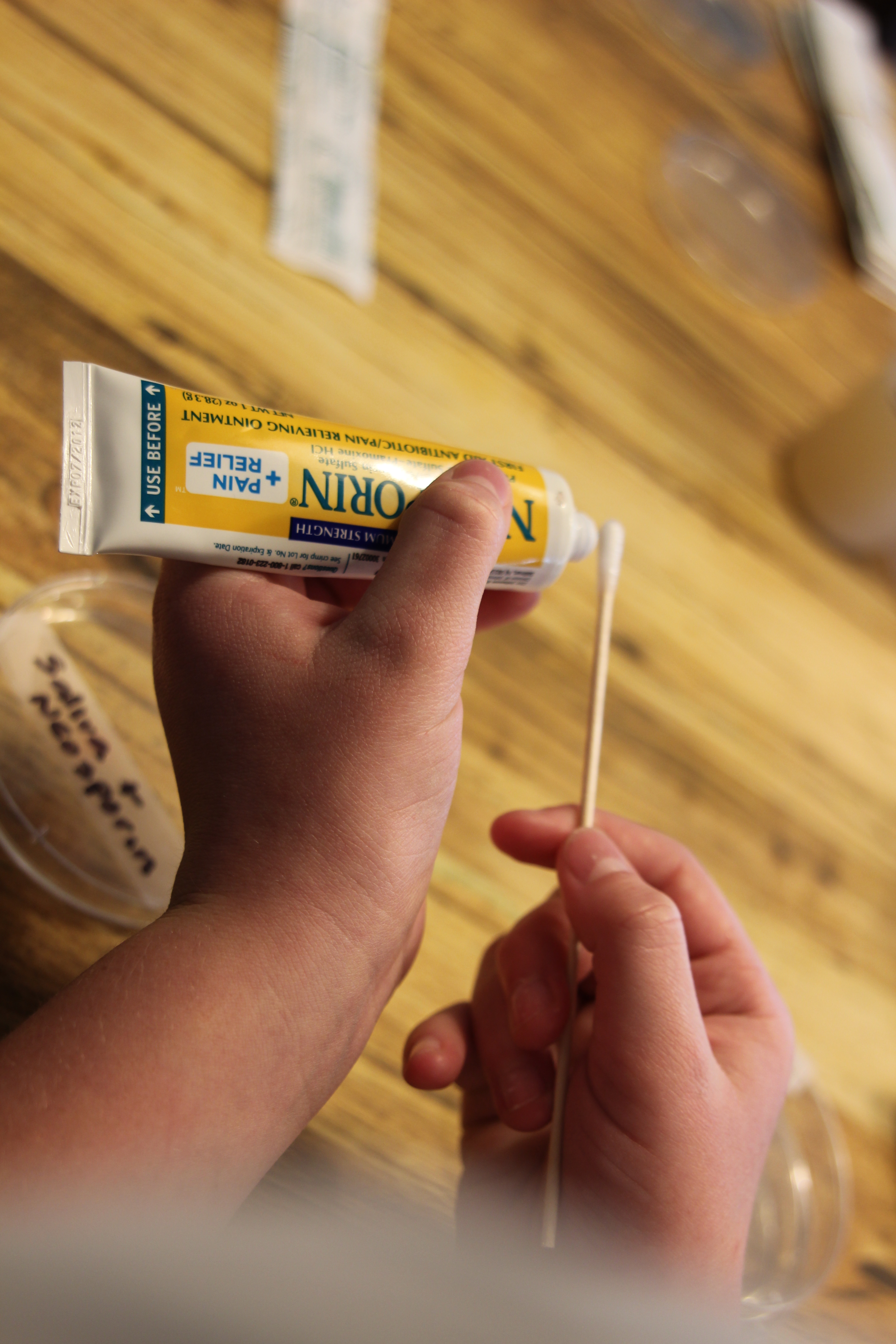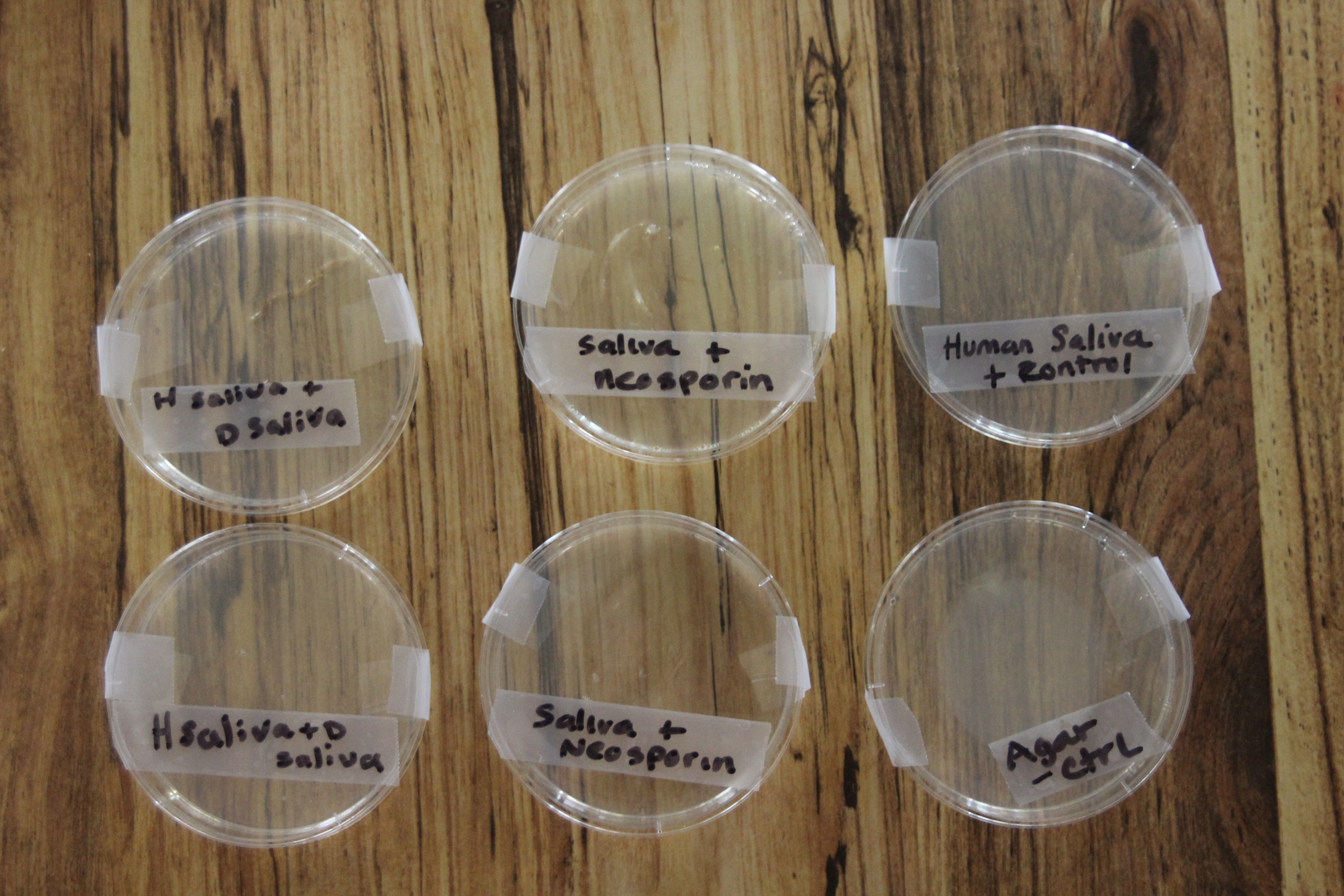 Today, we labeled the dishes and started the experiment. In one dish we left just the agar to show that it was not contaminated. In another dish we swabbed my saliva only. In two more dishes we swabbed my saliva and Neosporin. In the last two dishes we swabbed my saliva and Sunny’s saliva.