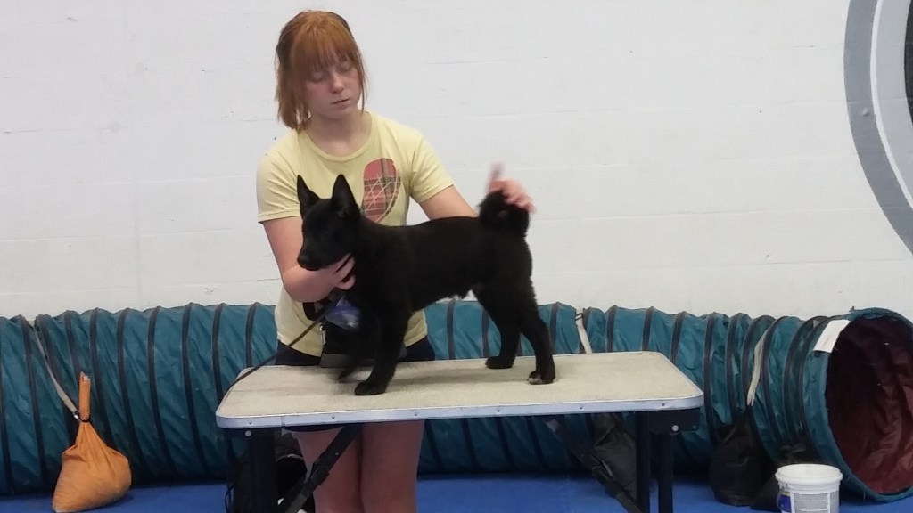 I also wanted to post some pictures of the new pup, Elliott, our Norwegian Buhund. I took him to his first conformation class tonight with George. He did so great. I worked with him first and he did not do so well. Then I had him sit and watch me work with Micta. He had another turn, and he did wonderful. Jealousy works.